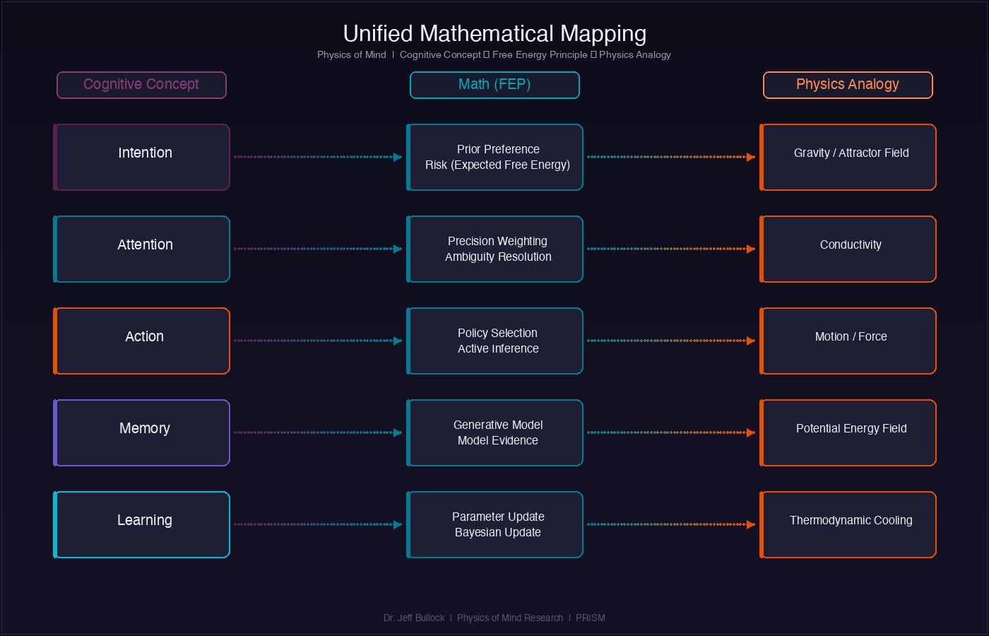 | Cognitive Concept | Math (FEP) | Control Theory | Physics Analogy | |---|---|---|---| | Intention | Prior Preference Matrix / Risk | Reference Signal / Set Point | Attractor Field (Gravity) | | Attention | Precision / Inverse Variance | Kalman Gain / Feedback Gain | Conductivity | | Action | Policy Selection minimizing G | Control Signal | Motion (Kinetic Energy) | | Conflict | High Entropy / High Free Energy | Error Signal | Potential Energy | | Willpower | Precision of the Policy | Actuation Force | Power (Work/Time) |